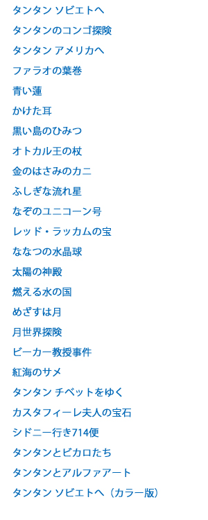 タンタン ソビエトへ タンタンのコンゴ探険 タンタン アメリカへ ファラオの葉巻 青い蓮 かけた耳 黒い島のひみつ オトカル王の杖 金のはさみのカニ ふしぎな流れ星 なぞのユニコーン号 レッド・ラッカムの宝 ななつの水晶球 太陽の神殿 燃える水の国 めざすは月 月世界探険 ビーカー教授事件 紅海のサメ タンタン チベットをゆく カスタフィオーレ夫人の宝石 シドニー行き714便 タンタンとピカロたち タンタンとアルファアート キャラクター/キャスト タンタン スノーウィ ハドック船長 ビーカー教授 デュポン&デュボン カスタフィオーレ夫人 TINTIN CAST 作者・エルジェについて タンタンとエルジェ エルジェ年表 ニュース&インフォメーション