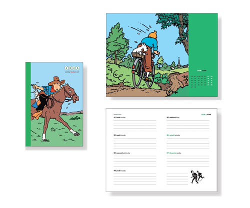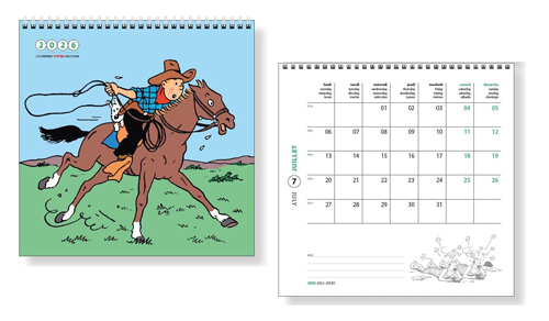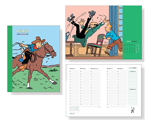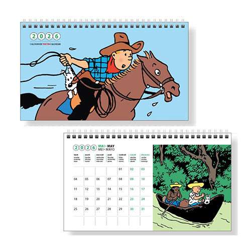 2026年度版輸入カレンダー! 今回のテーマは「アクション」です。 乗馬や登山、ロッククライミングからダイビングまで.. どんなときでも私たちのヒーローは勇敢に立ち向かいます。 冒険物語にふさわしい、アクティブで芸術的なグラフィックの中から、 象徴的な13のカットが抜粋されています。 2026年も「タンタンの冒険」をお楽しみください! 出典:タンタン アメリカへ(表紙)